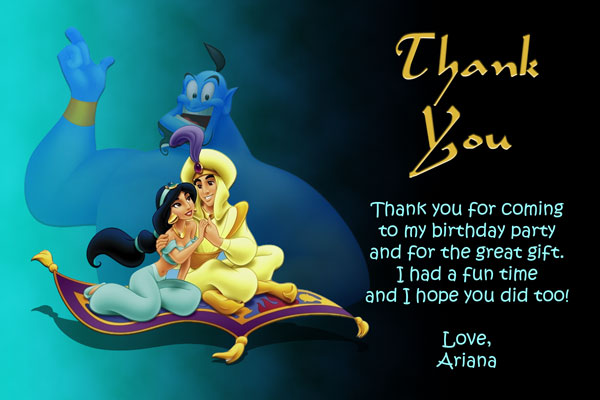 This invitation is inspired by the 1992 Disney film, Aladdin! The invite has the genie in the background and also has Aladdin and Princess Jasmine riding the magic carpet. The background colors may be changed upon request.