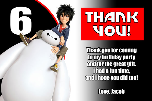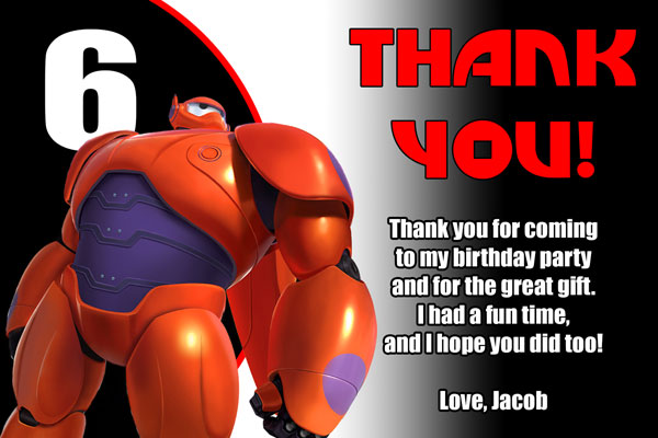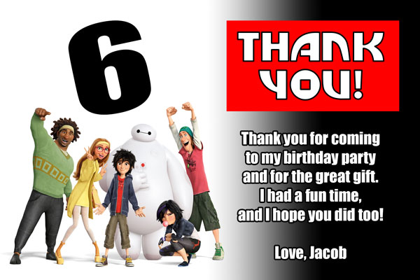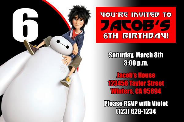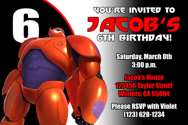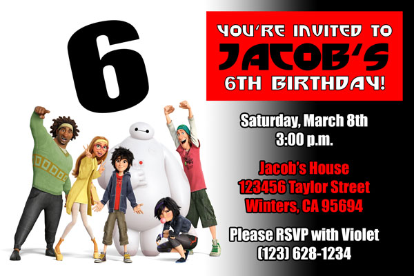 Order our custom made Big Hero 6 invitations. We have many styles available with your favorite characters from the movie. Including: Hiro, Baymax, Fred, GoGo, Wasabi and Honey Lemon. These invites are made using a font similar to the one used in Big Hero 6. The perfect invitations for your Big Hero 6 fan, they are sure to make your birthday a hit!