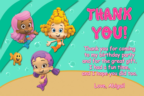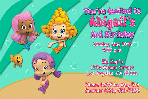 We have for sale, two bubble guppies invitations. They can be purchased for either boy or girl. Our boy invitation features the three most popular boy characters in the series. Gil, Goy and Nonny. This style is in ticket format. The colors are aqua, orange and turquoise. For the girl design, it also features the three more popular girls characters from the cartoon. Molly, Deema, and Oona. This invitation is in purple and pink with a few aqua colors for the water. All party details can be modified for any birthday as well as the color choices if needed. Since ticket invitations are smaller that their regular counterparts, we recommend you keep the party details simple for these to avoid any crowding of the wording. Both boy and girl styles can be ordered in a printable format as well, so that you can print these from home.