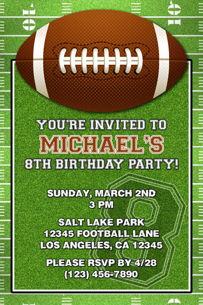 Our custom made Football invitations feature a football field in the background and a football graphic on the top of the invite. Your birthday party or any other occasion details will be placed in the middle of the card over a turf background.