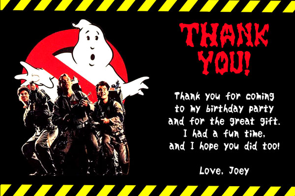 We have two Ghostbusters invitation designs available. Our first has caution tape on the top and bottom borders and features the Ghostbusters with the logo behind them. Style number two features only the logo without the men. Your party details will be displayed using a slimy looking font using red, green and white.