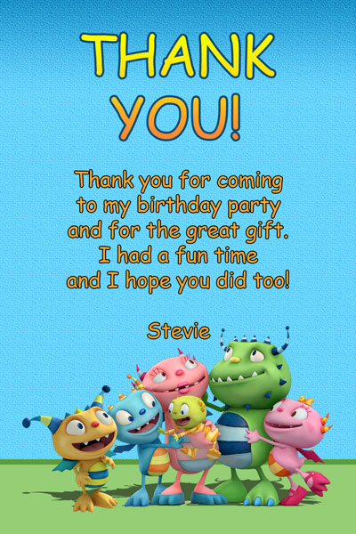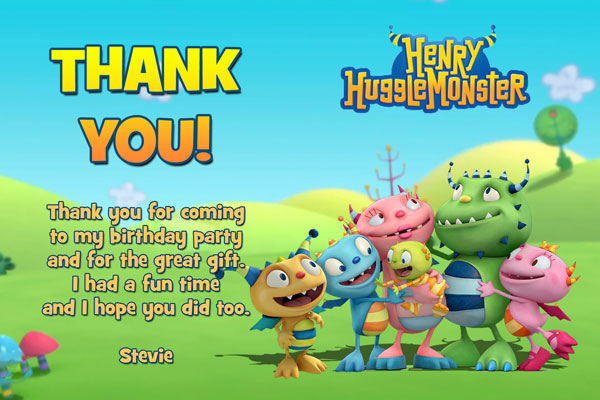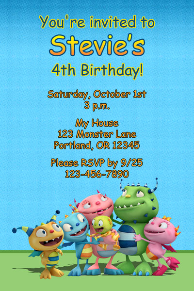 These Henry Hugglemonster invitations are Roarsome! We now have this birthday theme available for all the little monster lovers out there who are sure to roar when they invite their friends. These invites feature Henry along with his friends and family Summer, Dustin, Cobby, Jenny, and Ivor. This is a simple design that has the Hugglemonster family hugging as they look up to the party details. Prominence will be given to the birthday child's name by using a large font filled with an orange and yellow font. They are all standing on top of a green floor with a blue background with a light pattern on it. Feel free to request any color changes if you have any and we'll be sure to accommodate you.