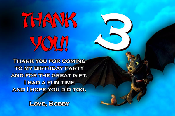 Our custom made How to train your Dragon invitations have the characters: Hiccup the Viking riding his dragon Toothless. The party details are added using an Asian style font in red and white colors. A large number will be added to display the age of the birthday boy/girl. While the background color is blue, we can also change it to any other color at no extra charge. Just ask!