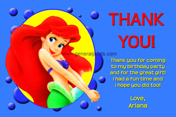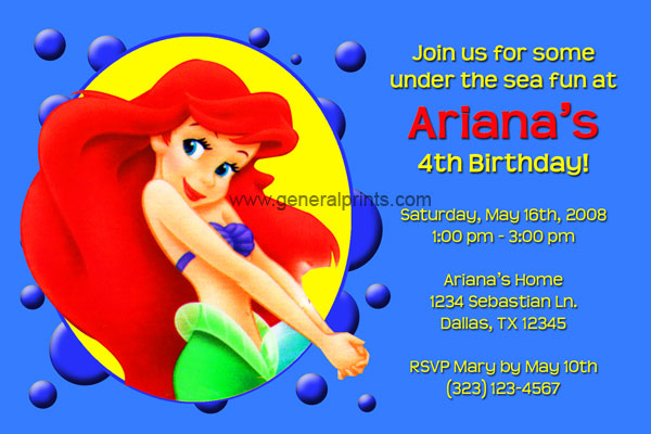 We have two little mermaid invitations available for ordering. Our first design features Ariel on the left side of the invite. The party details are displayed in yellow and red and can be changed to use your own custom wording. The background is blue and can also be changed upon request when ordering.