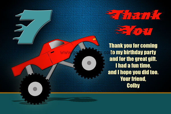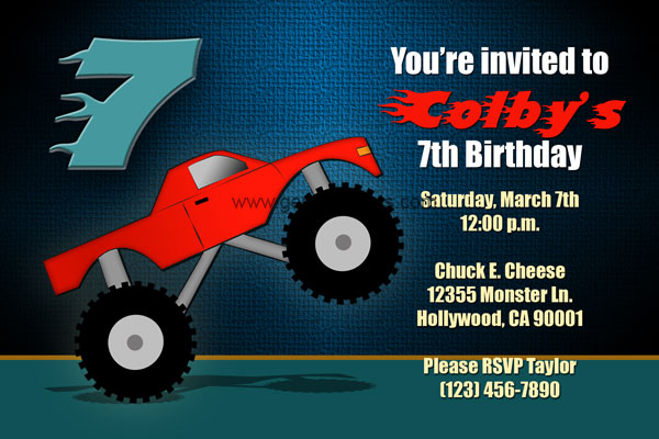 If you're looking for a more cartoon type of monster truck invite, then this is the one for you. This invitation features a simple red monster truck popping a willy. A large number will appear above the truck that will display your kids birthday age that they will be turning. While the other party details will be on the right hand side. You kids name will use a large fiery red font to stand out from the rest of the wording. We also have a cool thank you card that will go perfect with this invitation. All of the wording can be custom made by you and personalized to your liking.