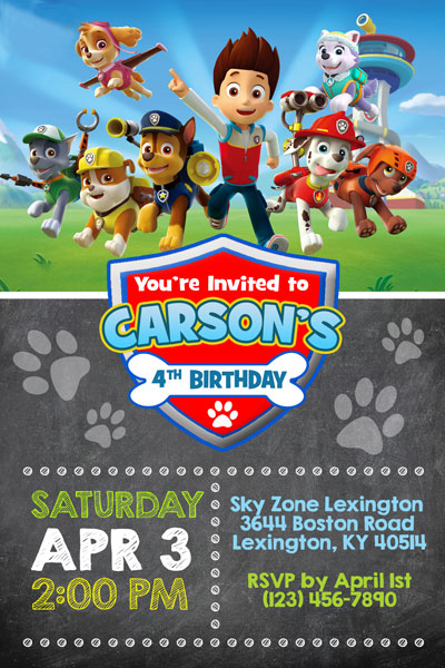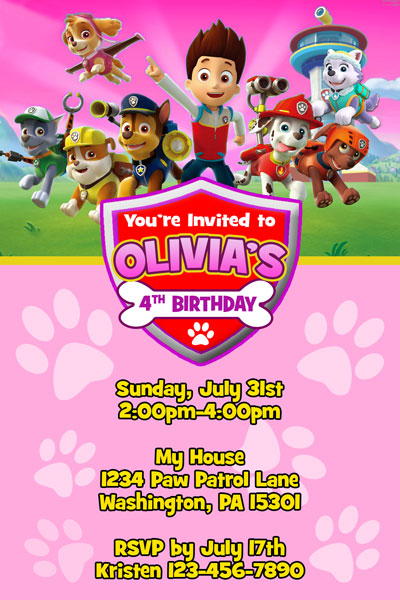 We have Paw Patrol invitations featuring your favorite seven pups from the tv show: Marshall, Chase, Zuma, Rubbie, Rocky, Skye and Everest and of course the boy Ryder. The design features your childs name inside the badge similar to the programs logo, and a background full of paw prints.