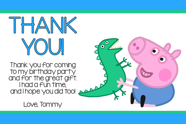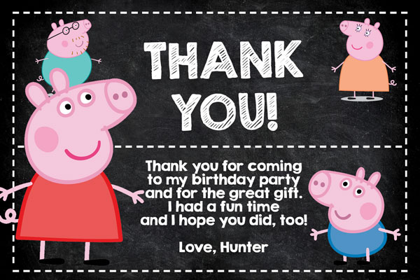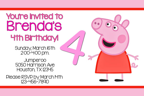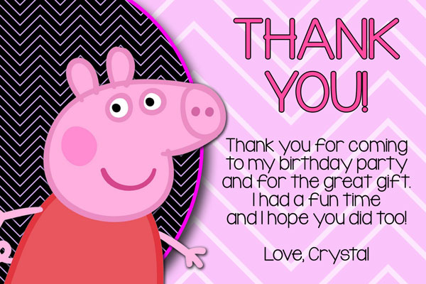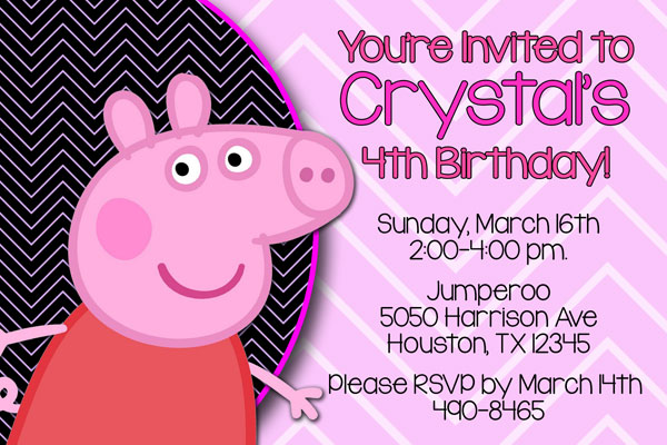 Invitations with Peppa Pig from the popular British children's television program. This invitation has Peppa Pig over a black and pink chevron pattern background on the left side. The party details will be displayed on the right side of the invitation using pink and black colors over a light pink and white chevron pattern.