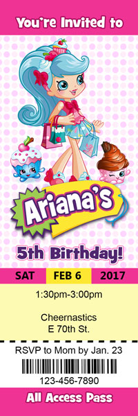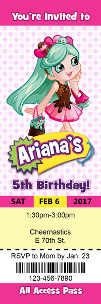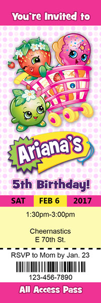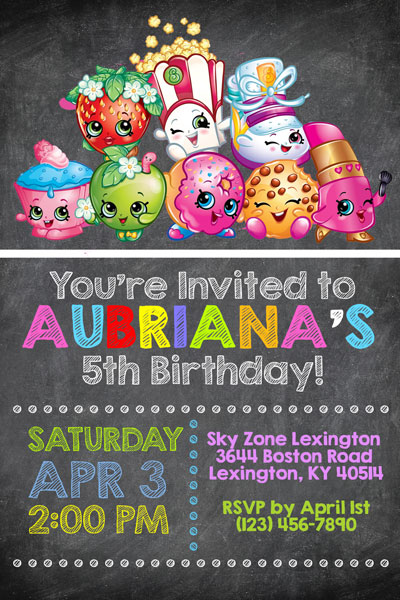 Shopkins invitations featuring all your favorite shoppies. Jessicake, Popette, Bubbleisha and Peppa-mint. Many styles available. Perfect to invite your guests to your next birthday party event.