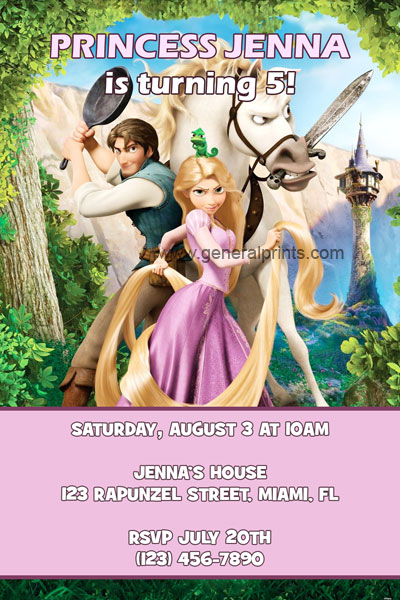 Our second design, uses the same characters from the movie, but this time over a more photographic background that is surrounded by leaves and a castle in the distance. The wording starts with "Princess Jenna" but can be re-worded to your liking. The event details will be placed over a pink background to avoid the text getting lost in the original leafy photo. So, don't wait any longer and order your Rapunzel invites today!